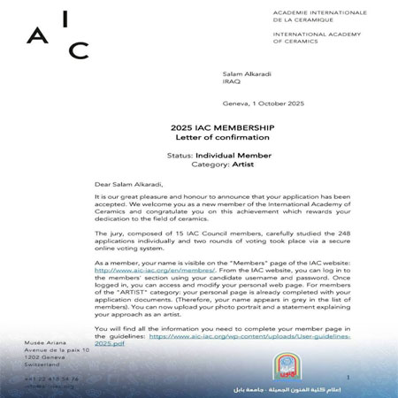 تدريسي في كلية الفنون الجميلة ينضم إلى الأكاديمية الدولية للخزف في جنيف?? تتقدّم عمادة كلية الفنون الجميلة في جامعة بابل، متمثلة بالأستاذ الدكتور عامر صباح المرزوك، بأسمى آيات التهاني والتبريكات إلى التدريسي في قسم الفنون التشكيلية الدكتور سلام أحمد الكرادي، بمناسبة انضمامه إلى الأكاديمية الدولية للخزف في جنيف – إحدى أعرق وأهم المؤسسات العالمية المعنية بفن الخزف المعاصر.ويُعد هذا الإنجاز العالمي مصدر فخر واعتزاز للكلية وللفن العراقي عامة، لما يجسّده من امتدادٍ حضاري وإبداعٍ أصيل يعكس مكانة الخزف العراقي في المشهد الفني الدولي، ويؤكد قدرة الفنان العراقي على المنافسة والإبداع في أرقى المحافل العالمية.كما تثمن عمادة الكلية الجهود المتميزة التي يبذلها فنانو العراق في ترسيخ الهوية الجمالية والثقافية للوطن، متمنية للدكتور سلام الكرادي المزيد من التألق والعطاء في خدمة الفن الأكاديمي والخزف المعاصر.___________مسؤول موقع الكلية / lمريم اسامة عبد_ موقع الكلية الرسمي ©?https://finearts.uobabylon.edu.iq/_ صفحة كلية الفنون الجميلة على الفيس بوك ©?https://www.facebook.com/share/1RFRk1RJLN/_ صفحة كلية الفنون الجميلة على الإنستغرام ©?https://www.instagram.com/finearts.uob?igsh=Yjd3bTFqdWVybWth_ موقع مجلة نابو ©?https://naboo.uobabylon.edu.iq/